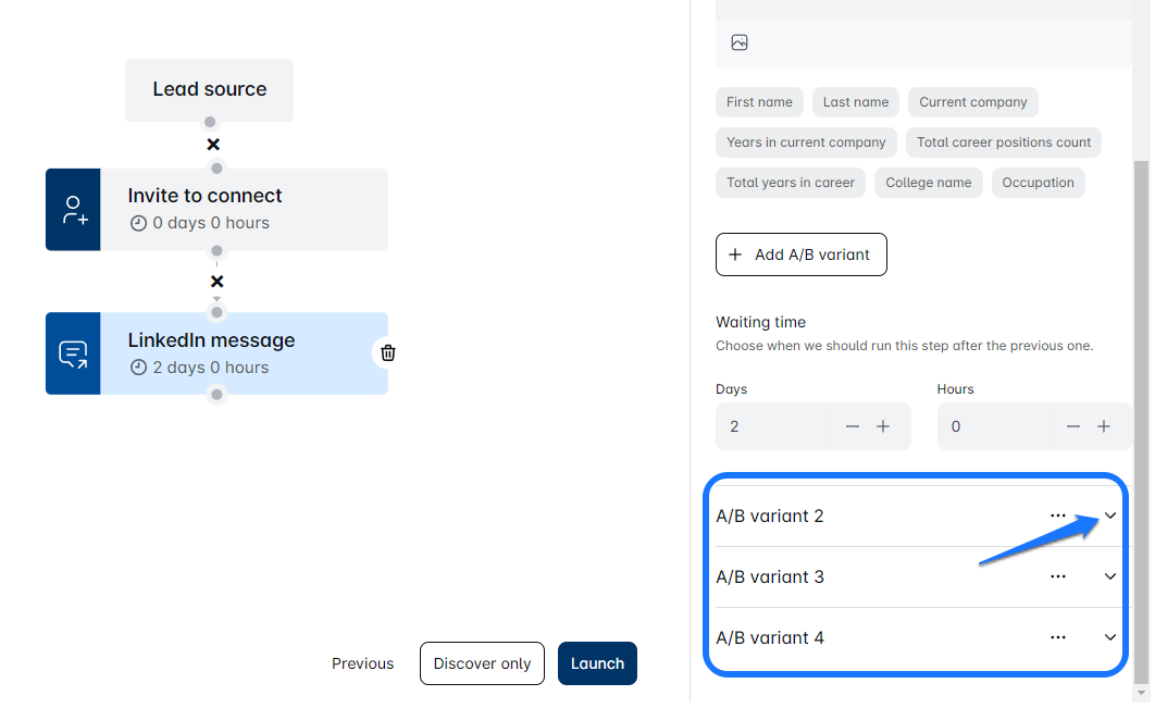 - In Leapforce, you can test different parts of your message copy, such as LinkedIn messages, Emails, InMails, Invites to Connect, or even the timing between the steps during the campaign sequence creation process. You can create up to 5 different test variants!