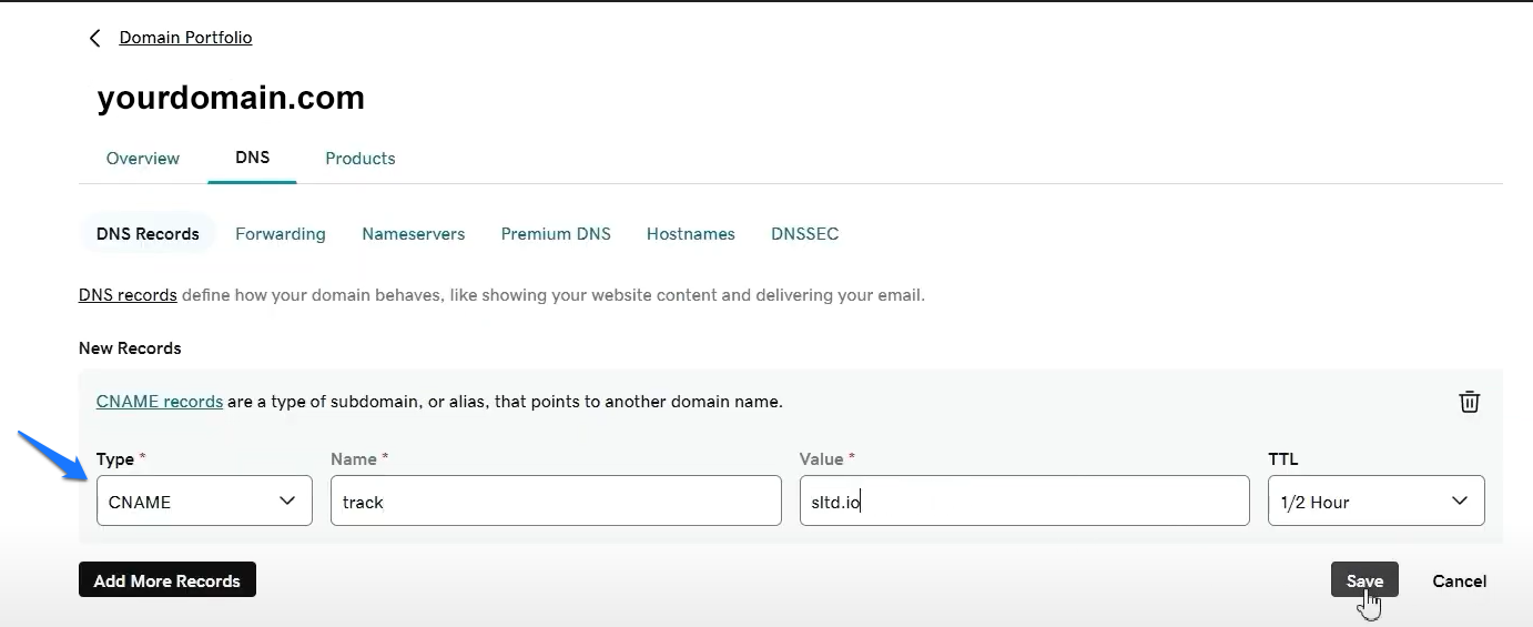 - This time, under record type in the dropdown menu, find CNAME, and paste the details provided in Leapforce’s Custom tracking domain settings.