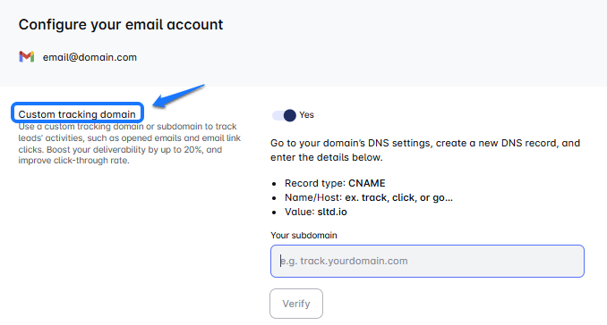 A custom tracking domain is important because it makes your email links look more professional and helps build trust with your prospects. Plus, it improves deliverability by aligning your links with your brand, which email servers like.